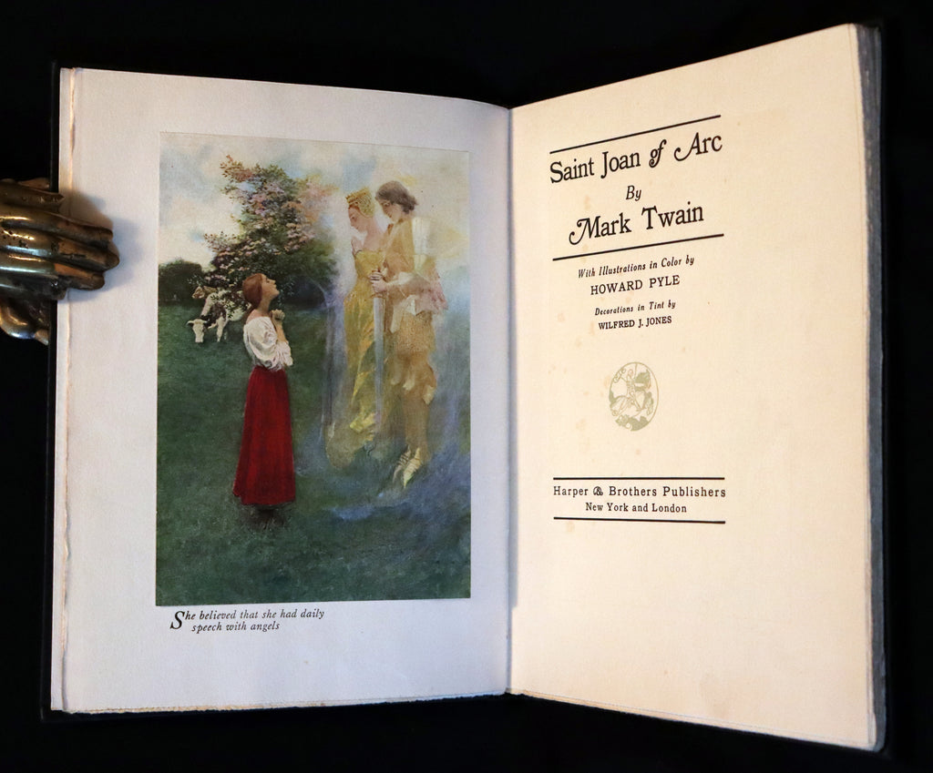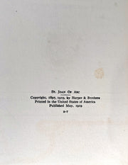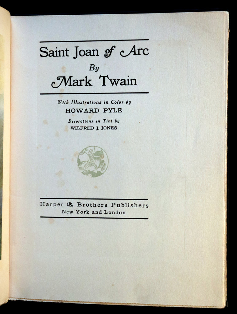 The book: Attractive and rare First edition of Mark Twain's Saint Joan of Arc. With illustrations in Color by Howard Pyle. Twain created a reverent portrayal of Joan of Arc, a subject over which he had obsessed for forty years, studied for a dozen years and spent two years writing about. In 1900 and again in 1908 he stated, "I like Joan of Arc best of all my books, it is the best". The story first appeared in Harpers Magazine in 1904. All points are present for a true first printing. A rare find in any condition!