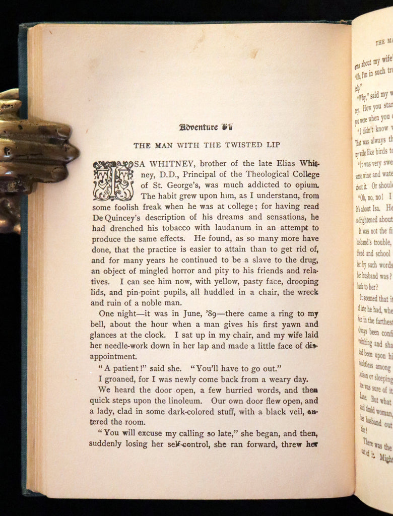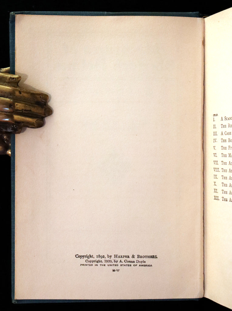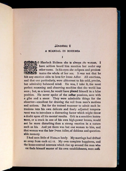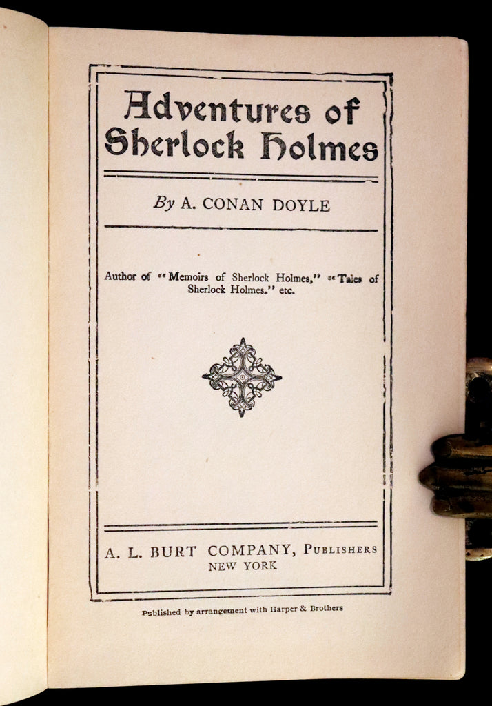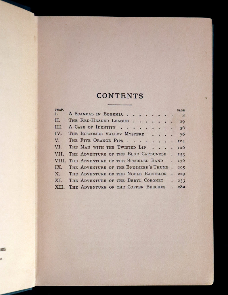 The book: Rare and very nice early edition of The ADVENTURES of SHERLOCK HOLMES including A Scandal in Bohemia, The Red-Headed League, A Case of Identity, The Boscombe Valley Mystery, The Five Orange Pips, The Man with the Twisted Lip, The Adventure of the Blue Carbuncle, The Adventure of the Speckled Band, The Adventure of the Engineer's Thumb, The Adventure of the Noble Bachelor, The Adventure of the Beryl Coronet, The Adventure of the Copper Beeches.