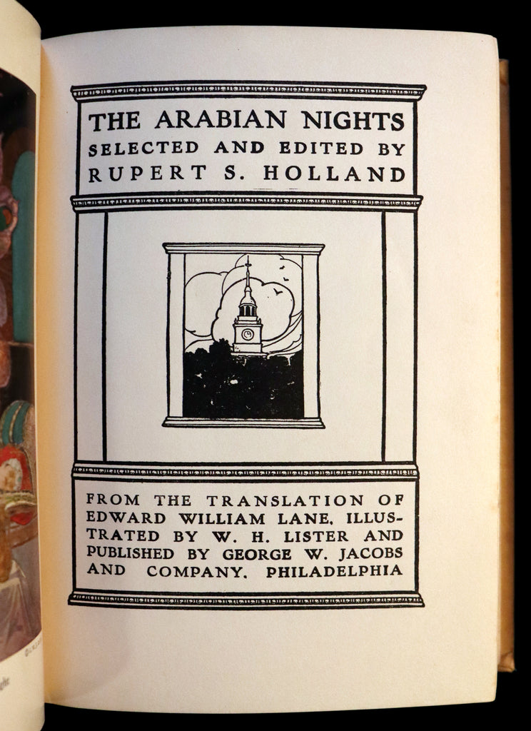 The book: Rare and attractive George W. Jacobs & Company edition of The ARABIAN NIGHTS (including Ali Baba, The story of Aladdin, and Sindbad the sailor) with beautiful color illustrations by William H. Lister.