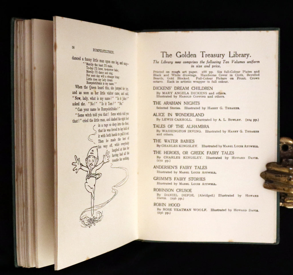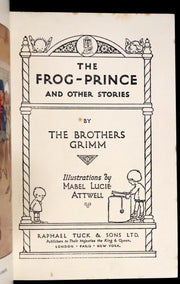 The book: Very attractive First edition of Mabel Lucie Attwell's illustrated edition of THE FROG PRINCE and Other Stories. It includes The Frog Prince, Little Snow-White, The Musicians of Bremen, The Cat and the Miller's Journeyman, Hansel and Grethel, Jorinda and Jorindel, The Three Languages, The Little Brother and Sister, Snow-White and Rose-Red, The Step-Sisters and the Dwarfs, The Table The Ass and The Stick, Rumpelstiltskin.