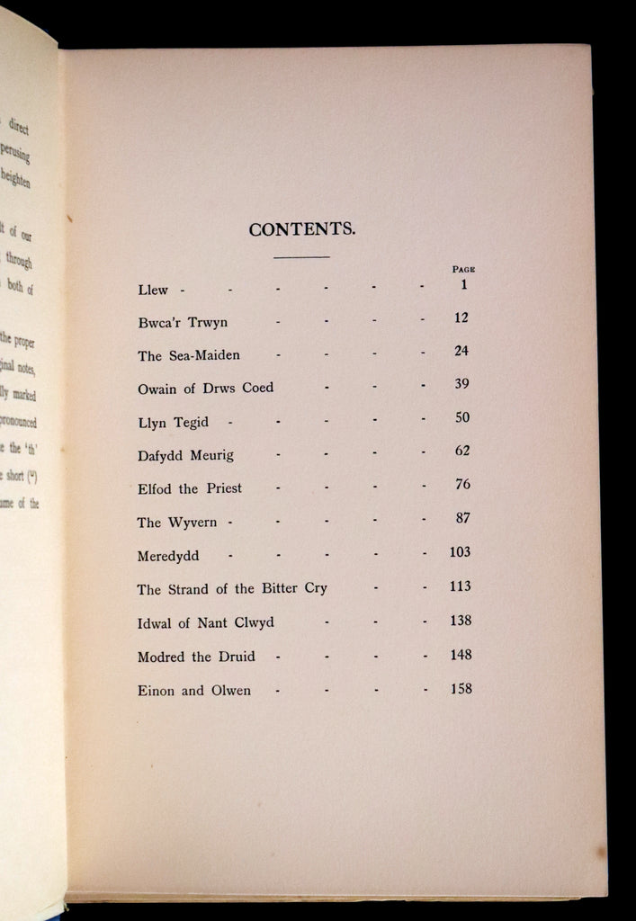 The book: Attractive and rare first edition of WONDER TALES OF ANCIENT WALES including those 13 Fairy Tales: Llew, Bwca'r Trwyn, The Sea-Maiden, Owain of Drws Coed, Llyn Tegid, Dafydd Meurig, Elfod the Priest, The Wyvern, Meredydd, The Strand of the Bitter Cry, Idwal of Nant Clwyd, Modred the Druid, Einon and Olwen.