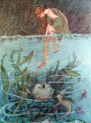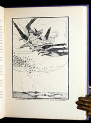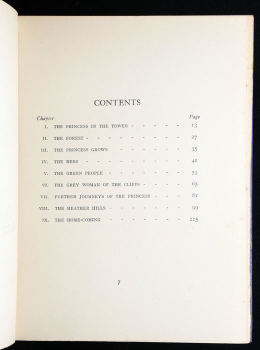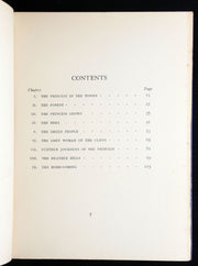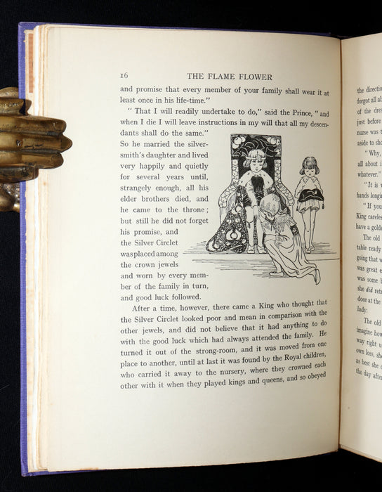 The book: The Flame Flower is a rare and visually captivating children’s fantasy novel. Centered around a young princess’s mystical journey through enchanted lands—forests, cliffs, and heather hills—it reflects a richly imaginative fairy-tale world, complete with symbolic flora, magical beings, and spiritual allegory. The chapter titles—such as The Princess in the Tower, The Grey Woman of the Cliffs, and The Fire Queen Brings the Silver Circlet—suggest a transformative hero's journey embedded in nature and myth. The lush illustrations by Hilda T. Miller bring this ethereal world to life, making it a collector’s gem of early 20th-century illustrated literature. The personal inscription and author’s signature further enhance the book’s historical and sentimental value.