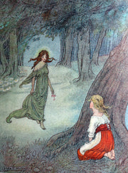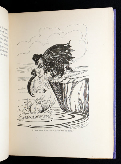The illustrator: Hilda T. Miller was a British artist active during the golden age of illustration. Her style blends delicate detail with a dreamlike sense of narrative, comparable to illustrators like Jessie Willcox Smith and Florence Harrison. In The Flame Flower, Miller’s colored plates and elegant line drawings elevate the storytelling, capturing its gentle mysticism and fairytale wonder.