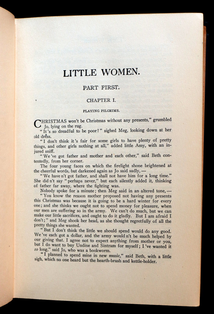 The book: Rare and attractive color illustrated edition by Jessie Willcox Smith of Little Women - Originally published in two volumes in 1868 and 1869, Alcott wrote the book over several months at the request of her publisher. The story follows the lives of the four March sisters—Meg, Jo, Beth, and Amy—and details their passage from childhood to womanhood. Loosely based on the lives of the author and her three sisters, it is classified as an autobiographical or semi-autobiographical novel.