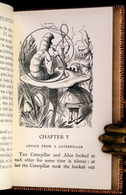 The book: A rare 1924-1928 miniature edition set of Lewis Carroll's "Alice's Adventures in Wonderland" and "Through the Looking Glass, And What Alice Found There," bound by the renowned bookbinder Zaehnsdorf. This exquisite set, featuring the iconic illustrations of John Tenniel, is a collector's delight, beautifully bound in scarlet morocco leather with intricate gilt decorations. The detailed craftsmanship of the binding, combined with Tenniel's timeless illustrations, make this set a unique and valuable addition to any collection.