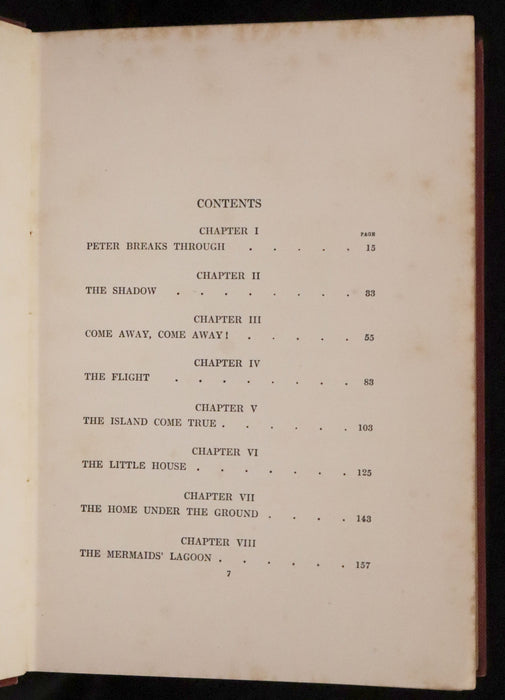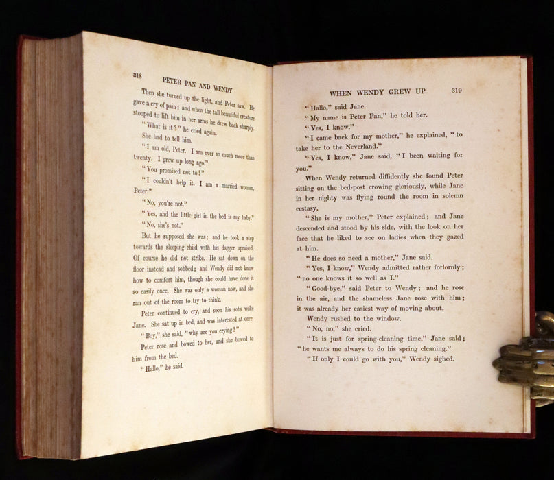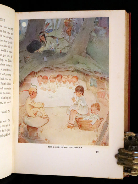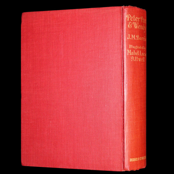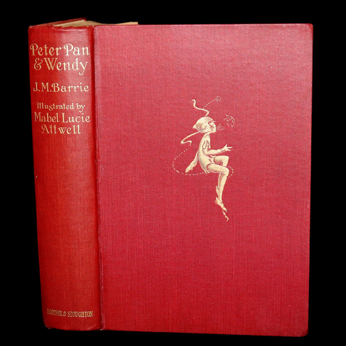 Binding: Attractive and near fine original red cloth binding with gilt decorations and titles on the front cover and spine. Cover features a gilt illustration of Peter Pan (hinges fine, overall slightly scuffed - as shown) under a protective removable mylar cover. Upper edge gilt.