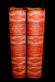 The book set: Attractive edition and scarce in a beautiful morocco binding of The Life of Sir William Osler. Sir William Osler, 1st Baronet, FRS FRCP (July 12, 1849 – December 29, 1919) was a Canadian physician and one of the four founding professors of Johns Hopkins Hospital. Osler created the first residency program for specialty training of physicians, and he was the first to bring medical students out of the lecture hall for bedside clinical training. He has frequently been described as the Father of Modern Medicine and one of the "greatest diagnosticians ever to wield a stethoscope". Osler was a person of many interests, who in addition to being a physician, was a bibliophile, historian, author, and renowned practical joker. Outside of medicine, he was passionate about medical libraries and medical history and among his achievements were the founding of the History of Medicine Society (formally "section"), at the Royal Society of Medicine, London.[4] In the field of librarianship he was instrumental in founding the Medical Library Association of Great Britain and Ireland, the (North American) Association of Medical Librarians (now known as the Medical Library Association) with three others, including Margaret Charlton, the medical librarian of his alma mater, McGill University. He left his large history of medicine library to McGill, where it continues to exist as the Osler Library.