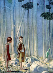 The illustrator: Thomas Mackenzie (1887 – 1944) was an English artist and illustrator.Mackenzie was born in Bradford, West Riding of Yorkshire, England, and became an artist producing illustrations for books, and watercolours. His earliest commissioned works were for Ali Baba and Aladdin and illustrations for James Stephens's The Crock of Gold , Arthur Ransome's Aladdin and His Wonderful Lamp in Rhyme, Christine Chaundler's Arthur and His Knights and James Elroy Flecker's Hassan. He failed to make a career as a painter in France and died in 1944. Mackenzie's illustrations are reminiscent of the work of his Art Nouveau peers, including Aubrey Beardsley, Harry Clarke and Kay Nielsen. His images for Arthur and His Knights, in particular, are stylistically similar to those of Nielsen in East of the Sun and West of the Moon.
