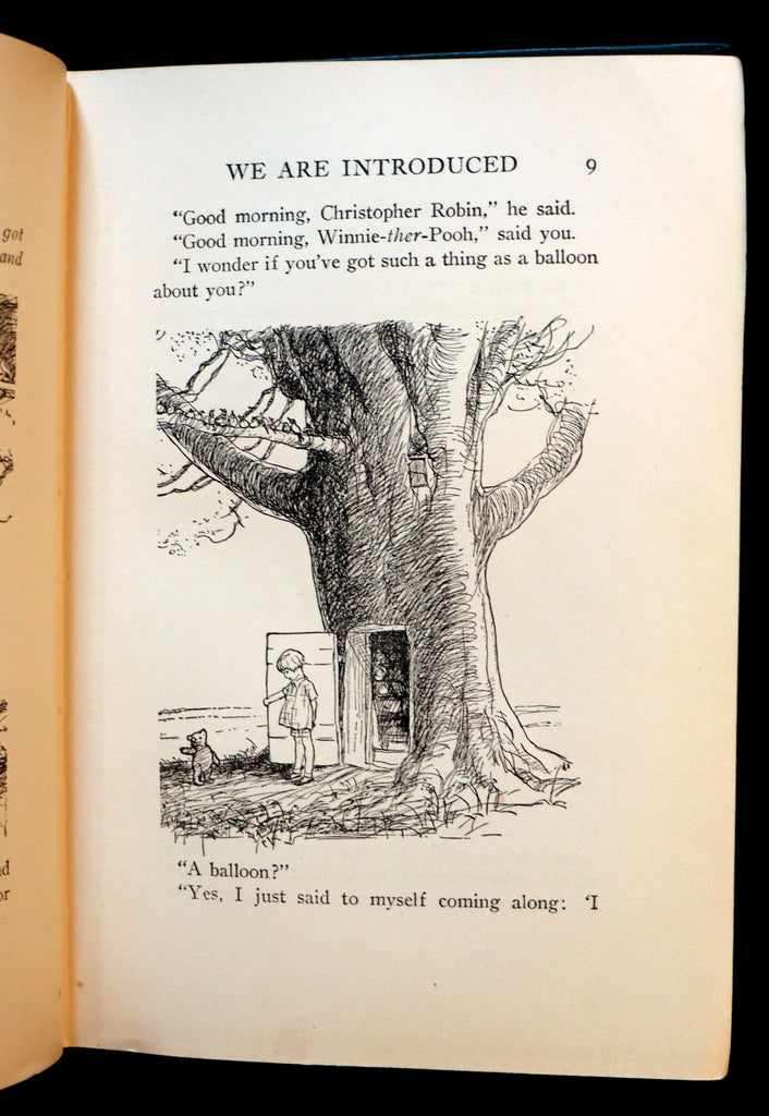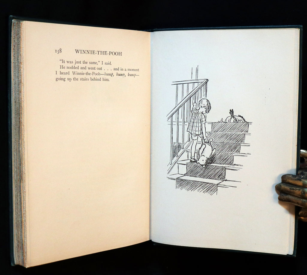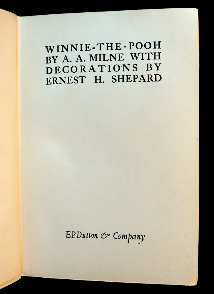 The book: Rare and Very Nice First American edition of Winnie-the-Pooh, also called Pooh Bear, - a fictional anthropomorphic bear created by A. A. Milne. The first collection of stories about the character was the book Winnie-the-Pooh (1926), and this was followed by The House at Pooh Corner (1928). Milne also included a poem about the bear in the children’s verse book When We Were Very Young (1924) and many more in Now We Are Six (1927). All four volumes were illustrated by E. H. Shepard.(Hyphens in the character's name were dropped by Disney when the company adapted the Pooh stories into a series of features that became one of its most successful franchises.)The Pooh stories have been translated into many languages, including Alexander Lenard's Latin translation, Winnie ille Pu, which was first published in 1958, and, in 1960, became the only Latin book ever to have been featured on The New York Times Best Seller list. In popular film adaptations, Pooh Bear has been voiced by actors Sterling Holloway, Hal Smith, and Jim Cummings in English and Yevgeny Leonov in Russian.