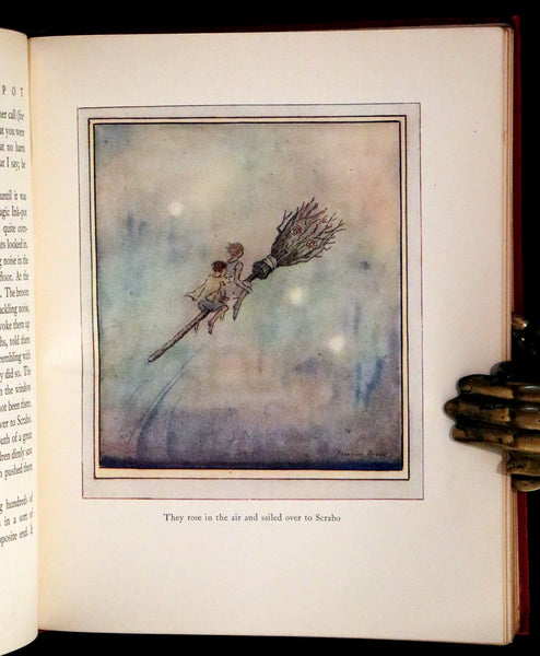 Binding: Attractive and very good, near fine original full cloth binding with a gilt broom on the front cover with boy and girl riding it (hinges fine, overall slightly scuffed - as shown) under a protective removable mylar cover. Upper edge gilt.
