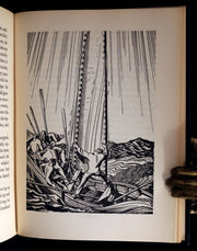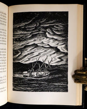 The illustrator: Rockwell Kent (June 21, 1882 – March 13, 1971) was an American painter, printmaker, illustrator, writer, sailor, adventurer and voyager. Approached in 1926 by publisher R. R. Donnelley to produce an illustrated edition of Richard Henry Dana, Jr.'s Two Years Before the Mast, Kent suggested Moby-Dick instead. Published in 1930 by the Lakeside Press of Chicago, the three-volume limited edition (1,000 copies) filled with Kent's haunting black-and-white pen/brush and ink drawings sold out immediately; Random House also produced the first trade edition.
