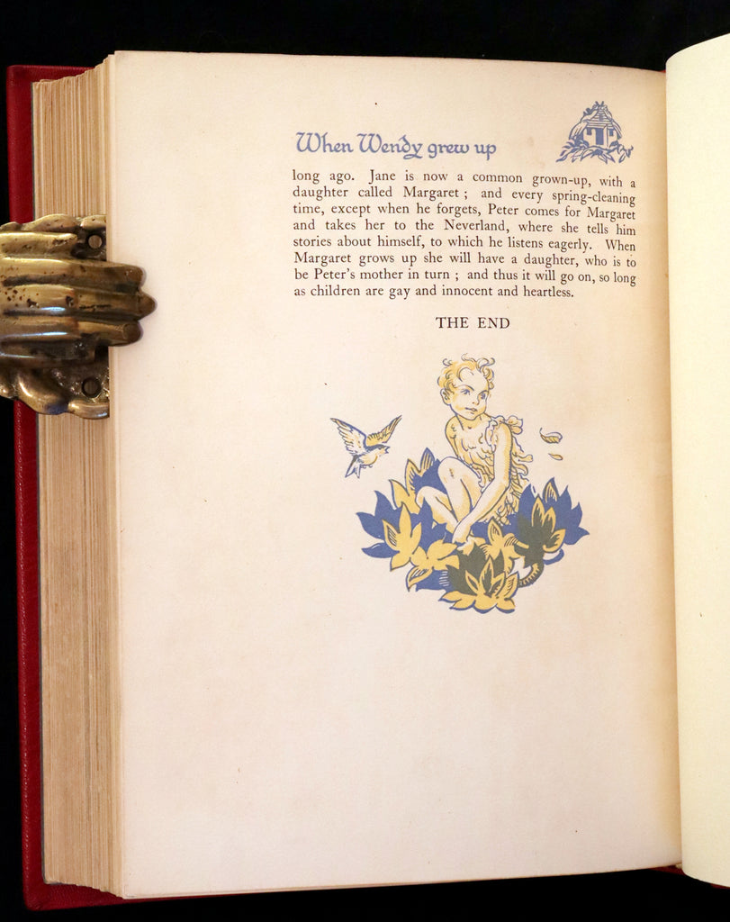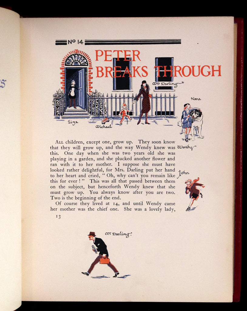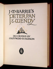 The book: Attractive and Rare in such a wonderful binding! First Illustrated Edition by Gwynedd Hudson of Peter Pan; or, the Boy Who Wouldn't Grow Up or Peter and Wendy -- J. M. Barrie's most famous work, in the form of a 1904 play and a 1911 novel. Both versions tell the story of Peter Pan, a mischievous little boy who can fly, and his adventures on the island of Neverland with Wendy Darling and her brothers, the fairy Tinker Bell, the Lost Boys, the Indian princess Tiger Lily, and the pirate Captain Hook. The play and novel were inspired by Barrie's friendship with the Llewelyn Davies family. Barrie continued to revise the play for years after its debut; the novel reflects one version of the story.