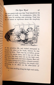 The book Rare First edition illustrated by Shepard of The Wind in the Willows -- a children's book by Scottish novelist Kenneth Grahame, first published in 1908. Alternatingly slow-moving and fast-paced, it focuses on four anthropomorphized animals: Mole, Rat (a European water vole), Toad, and Badger. They live in a pastoral version of Edwardian England. In 1908 Grahame retired from his position as secretary of the Bank of England. He moved back to Berkshire, where he had lived as a child, and spent his time by the River Thames, doing much as the animal characters in his book do – to quote, "simply messing about in boats" – and expanding the bedtime stories he had earlier told his son Alastair into a manuscript for the book.
