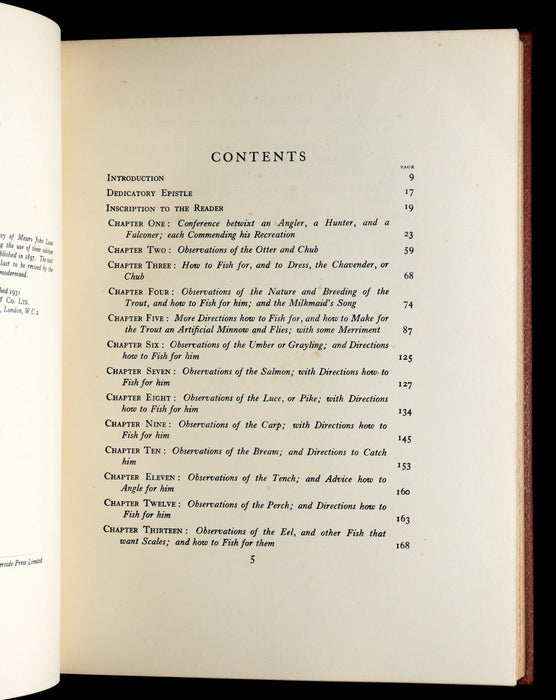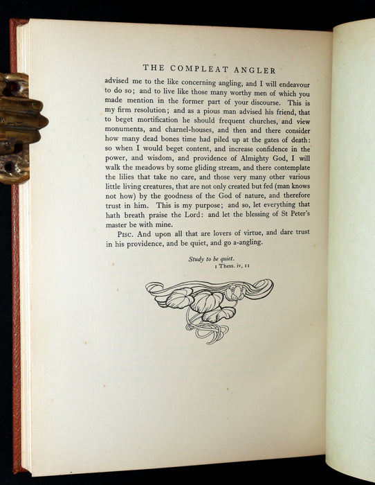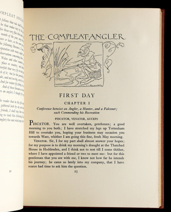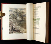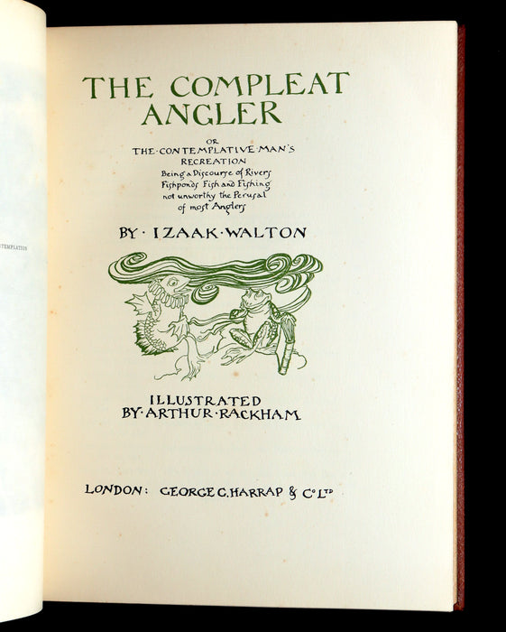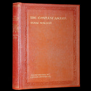 The book: Rare and Attractive First illustrated edition by Rackham in the special publisher's morocco binding of The Compleat Angler (the spelling is sometimes modernized to The Complete Angler, though this spelling also occurs in first editions) -- a book by Izaak Walton. It was first published in 1653 by Richard Marriot in London. Walton continued to add to it for a quarter of a century. It is a celebration of the art and spirit of fishing in prose and verse.