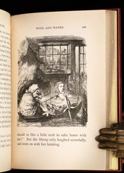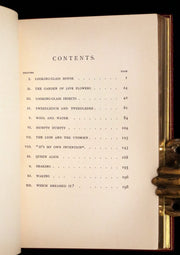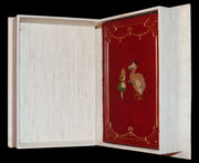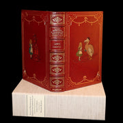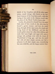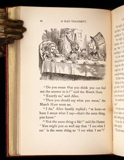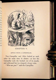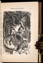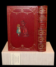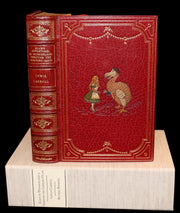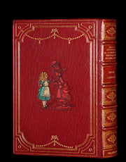 Binding: Very attractive and near fine full red morocco leather binding, finely bound by Riviere and Son with gilt rulings and ribbon garland to front and rear covers. The spine has six compartments with five raised bands with title, author, and fleur de lis designs. The front cover has a beautiful embossed illustration with color inlays of Alice and the Dodo bird. On the back is a color illustration of Alice and the Red Queen. (Hinges fine, overall slightly worn and scuffed - as shown) under a protective removable mylar cover in a near fine modern cream full-cloth covered clamshell box with paper title label to spine. An exquisite binding!