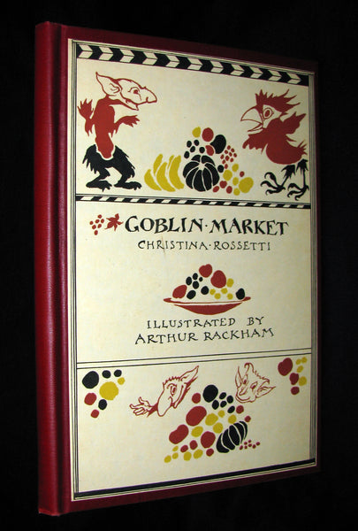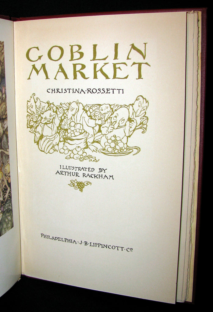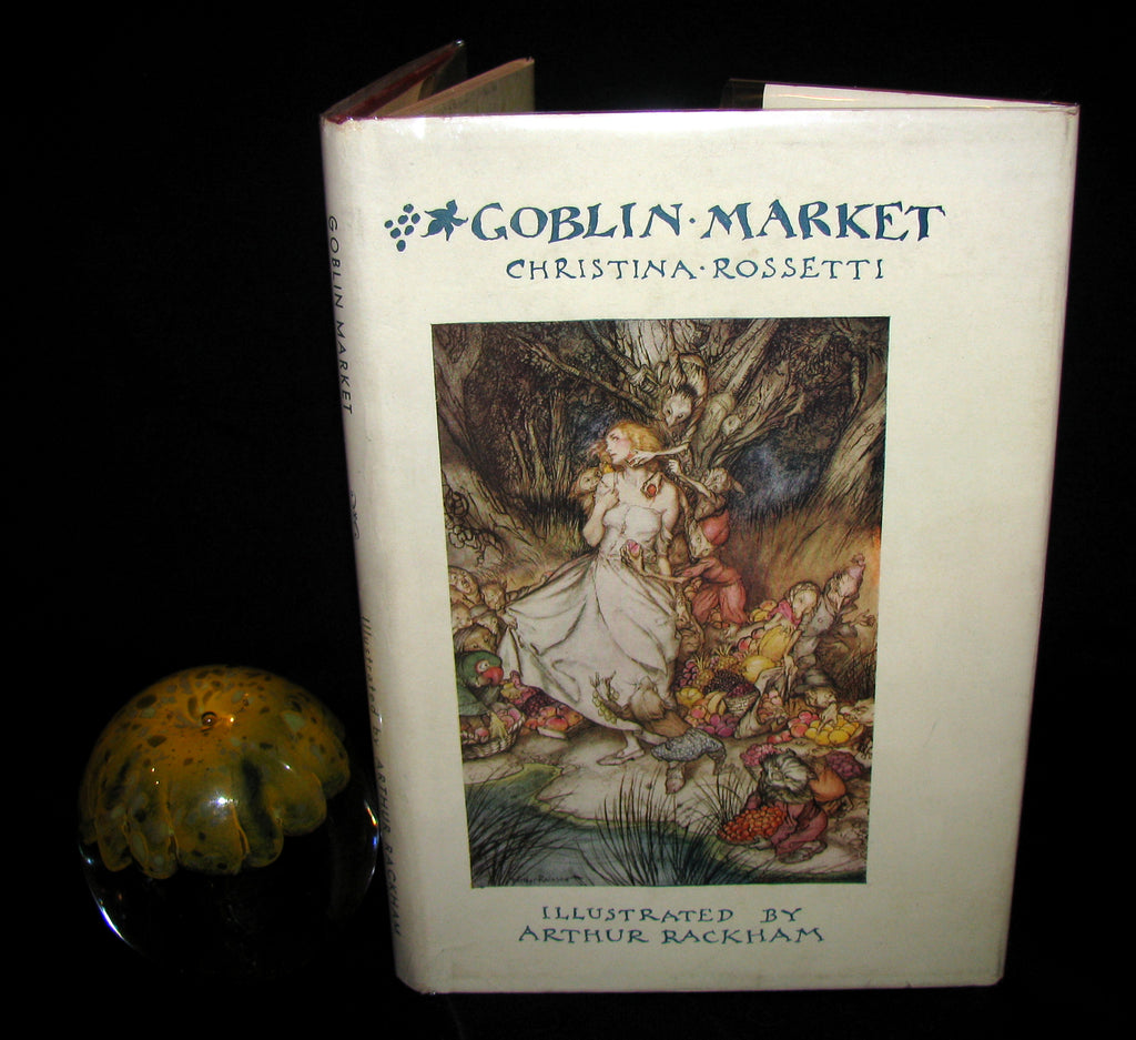 The book : Rare and Nice First American illustrated by Rackham edition of "Goblin Market" -- a popular narrative poem from Rossetti's first commercially published collection of poetry, Goblin Market and Other Poems (1862). The poem tells the story of two sisters, Laura and Lizzie, who encounter a group of goblin merchants while they collect water at a stream near their home, and, while Lizzie keeps her distance, Laura is lured by the goblins' strange features and luscious fruits. While the first 1862 edition was illustrated by the poet's brother Dante Gabriel Rossetti, this edition contains artwork by noted illustrator Arthur Rackham.