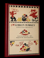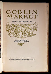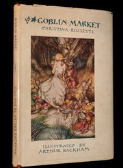 The book: Rare and very nice First American illustrated edition by Rackham of "Goblin Market" -- a popular narrative poem from Rossetti's first commercially published collection of poetry, Goblin Market and Other Poems (1862). The poem tells the story of two sisters, Laura and Lizzie, who encounter a group of goblin merchants while they collect water at a stream near their home, and, while Lizzie keeps her distance, Laura is lured by the goblins' strange features and luscious fruits. While the first 1862 edition was illustrated by the poet's brother Dante Gabriel Rossetti, this edition contains artwork by noted illustrator Arthur Rackham.