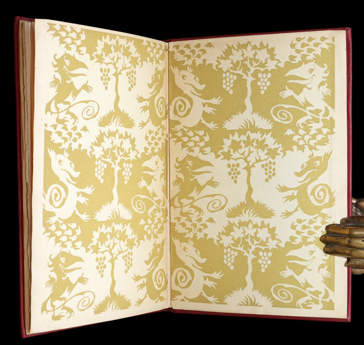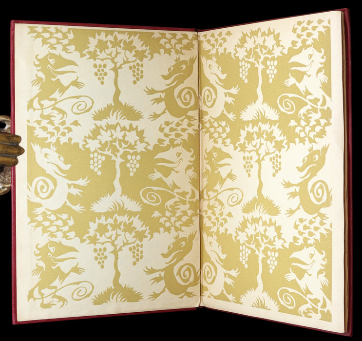 Binding: Attractive and very good, neat fine original red cloth with a color pictorial paper-covered front board, showing stylized goblin creatures and fruit design in red, yellow, and black; plain red cloth rear board. Spine unlettered as issued (hinges fine, overall slightly scuffed - as shown) under a protective removable mylar cover.
