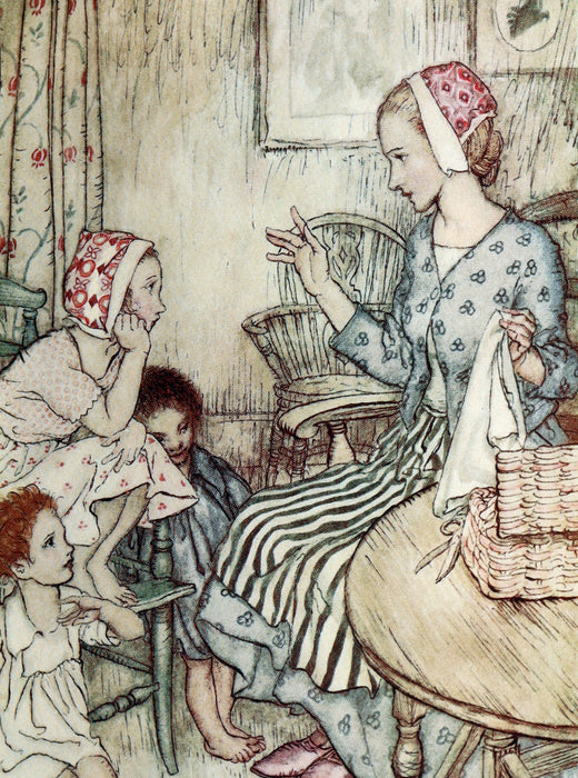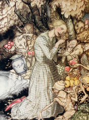 The illustrator: Arthur Rackham (1867–1939) was one of the leading figures of the Golden Age of British book illustration. His work is known for its fluid lines, ethereal fantasy, and moody atmosphere. In Goblin Market, Rackham’s illustrations emphasize both the sensual and the eerie nature of the text, drawing viewers into the goblin-haunted woods of Rossetti’s imagination.