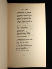 The decorator: Valenti Angelo (1897–1982) was an Italian-born American illustrator, typographer, and designer known for his refined decorative work in fine press and trade editions. His restrained yet elegant ornamental designs in this volume complement Parker’s poetry with a modern classicism characteristic of the 1930s book arts tradition.