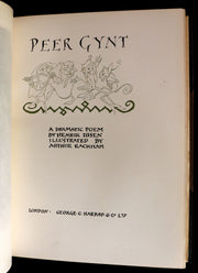The book: Rare and Attractive First edition illustrated by Rackham of Peer Gynt -- a five-act play in verse by the Norwegian dramatist Henrik Ibsen published in 1867. Written in Norwegian,it is one of the most widely performed Norwegian plays. Ibsen believed Per Gynt, the Norwegian fairy tale on which the play is loosely based, to be rooted in fact, and several of the characters are modeled after Ibsen's own family, notably his parent Knud Ibsen and Marichen Altenburg. He was also generally inspired by Peter Christen Asbjørnsen's collection of Norwegian fairy tales, published in 1845 (Huldre-Eventyr og Folkesagn). Peer Gynt chronicles the journey of its title character from the Norwegian mountains to the North African desert. According to Klaus Van Den Berg, "its origins are romantic, but the play also anticipates the fragmentations of emerging modernism" and the "cinematic script blends poetry with social satire and realistic scenes with surreal ones."