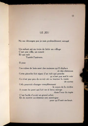The book: Attractive and scarce first edition SIGNED by St-Denys-Garneau of Regards et Jeux dans l'espace. It was published in March 1937 and received a rather cold reception from critics, which (we like to believe,) would have deeply shaken the author. However "contrary to what has been said, Garneau is in no way discouraged by the critical reception: What is to be feared here is the silence he wrote. Also, a month after the publication, "he even undertook, which is completely surprising on his part, an advertising 'campaign' to publicize his book and even then, Garneau did not foresee any particular difficulty in terms of critical reception." De Saint-Denys Garneau constructed the book according to a very meticulous plan: the layout of the titles and sections in no way determines the layout of the poems. Moreover, one must constantly leave the text and its comprehension and jump to the table of contents to know the titles, the numbers or the order of the poems, since in the text some are titled, others not. These choices are not arbitrary, the table of contents of the original edition having been meticulously prepared by de Saint-Denys Garneau. Looks and Plays in space is composed of twenty-eight poems and divided into seven sections, unified, when we add "Accompaniment", unnumbered, at the end of the seventh section, entitled "Untitled". As Romain Légaré underlines: “the book is supported, like a vital necessity, by an indestructible law, that of the unity of opposites”.
