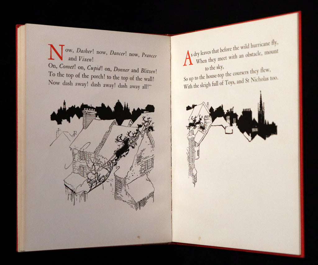 The book: Rare in such a nice binding by Sangorski & Sutcliffe bindery, a beautifully illustrated edition by Rackham of The Night Before Christmas by Clement C. Moore. A Visit from St. Nicholas, more commonly known as The Night Before Christmas and 'Twas the Night Before Christmas from its first line, is a poem first published anonymously in 1823 and later attributed to Clement Clarke Moore, who claimed authorship in 1837. The poem has been called "arguably the best-known verses ever written by an American" and is largely responsible for some of the conceptions of Santa Claus from the mid-nineteenth century to today. It has had a massive effect on the history of Christmas gift-giving. Before the poem gained wide popularity, American ideas had varied considerably about Saint Nicholas and other Christmastide visitors. A Visit from St. Nicholas eventually was set to music and has been recorded by many artists.