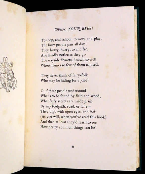 The book: Attractive First edition of this exquisite omnibus volume by Cicely Mary Barker. The scarcest of the combined Flower Fairies volumes. `Flower Fairies of the Garden', `Flower Fairies of the Wayside', and `Flower Fairies of the Trees'. One of the great fairy texts, personifying every variety of flowers, grass, plant with a fairy child.