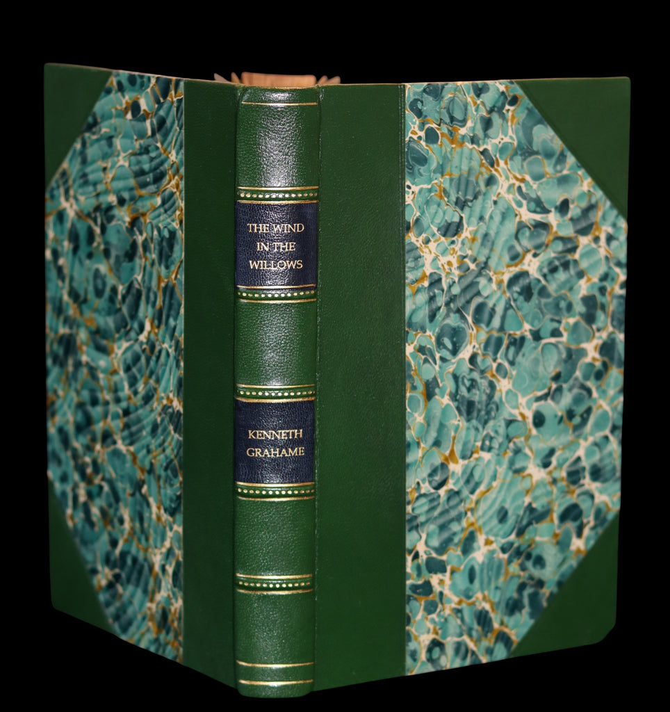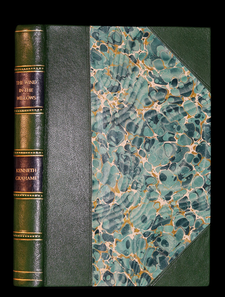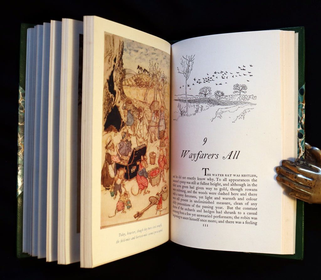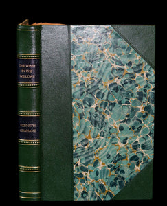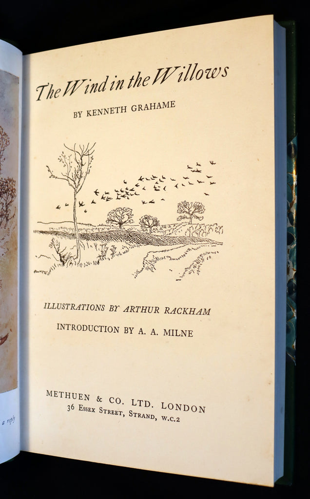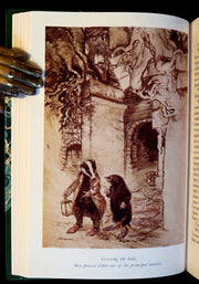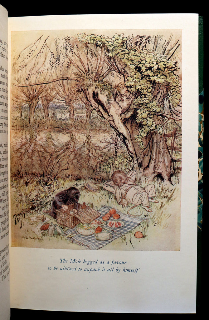 The book Rare and Attractive First edition illustrated by Rackham of The Wind in the Willows -- a children's book by Scottish novelist Kenneth Grahame, first published in 1908. Alternatingly slow-moving and fast-paced, it focuses on four anthropomorphized animals: Mole, Rat (a European water vole), Toad, and Badger. They live in a pastoral version of Edwardian England. In 1908 Grahame retired from his position as secretary of the Bank of England. He moved back to Berkshire, where he had lived as a child, and spent his time by the River Thames, doing much as the animal characters in his book do – to quote, "simply messing about in boats" – and expanding the bedtime stories he had earlier told his son Alastair into a manuscript for the book.