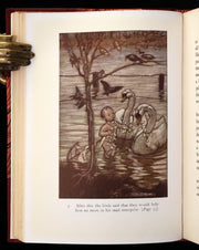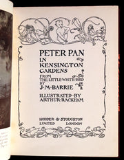 The book: Beautifully bound Edition illustrated by Rackham of Peter Pan in Kensington Gardens -- a novel by J. M. Barrie, illustrated by Arthur Rackham, and published by Hodder & Stoughton; it is one of four major literary works by Barrie featuring the widely known literary character he created, Peter Pan. Most of the text originally appeared as chapters 13–18 of Barrie's 1902 novel The Little White Bird.