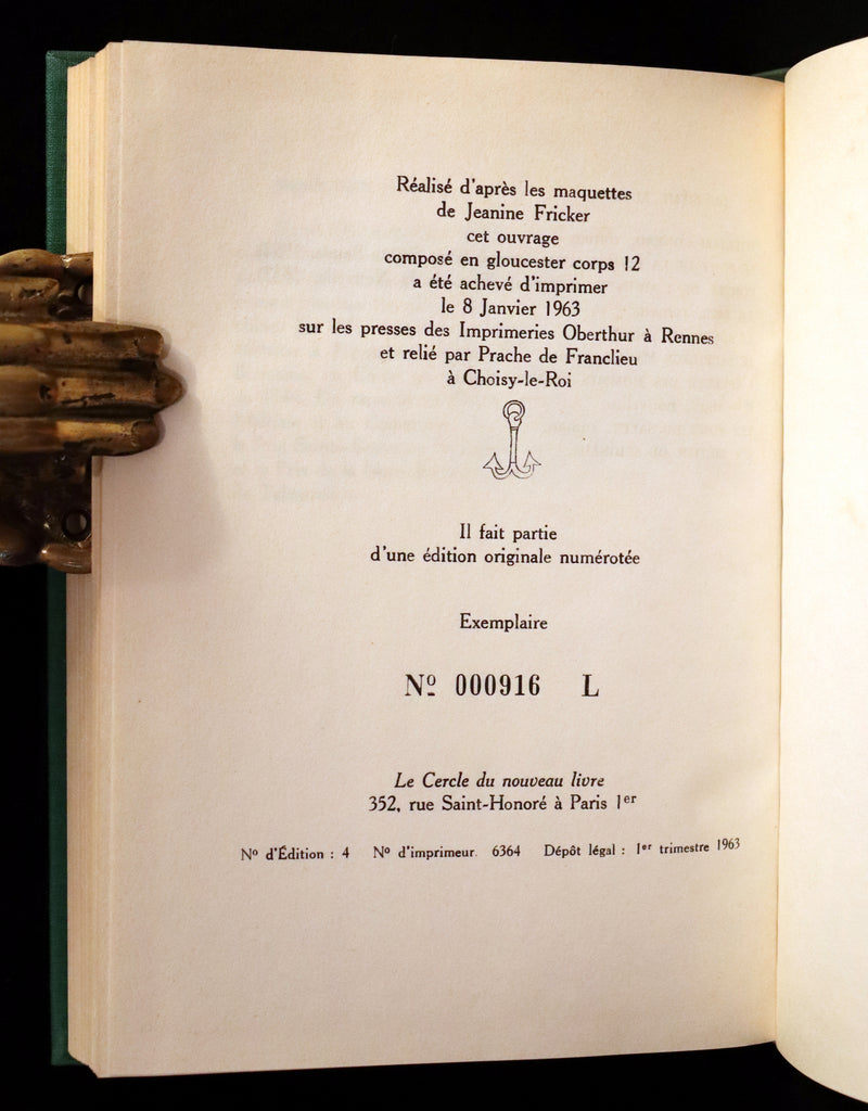 Publisher : Paris: Le Cercle du Nouveau Livre, 1963. First edition, first printing, published in the original French language; Copy number #916 of an unspecified First limited edition.