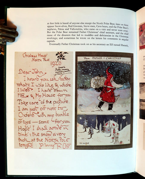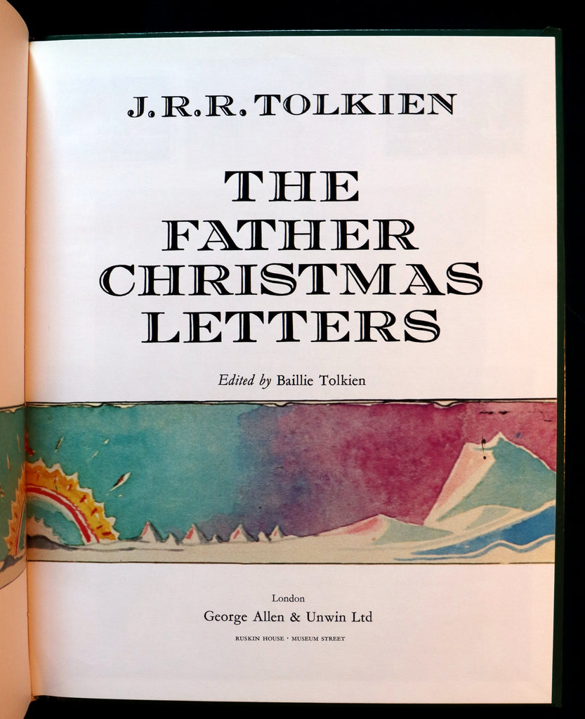 The book: Beautiful and attractive First UK Edition (published before the First US Edition) of The Father Christmas Letters, also known as Letters from Father Christmas, -- a collection of letters written and illustrated by J. R. R. Tolkien between 1920 and 1943 for his children, from Father Christmas. They were released posthumously by the Tolkien estate on 2 September 1976, the 3rd anniversary of Tolkien’s death. They were edited by Baillie Tolkien, the second wife of his youngest son, Christopher. The book was warmly received by critics, and it has been suggested that elements of the stories inspired parts of Tolkien's The Lord of the Rings. The UK's first edition was by Allen and Unwin on 2 September 1976, three years after Tolkien's death. The Houghton Mifflin First US edition was released later that year on 19 October.