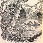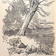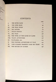 The book Beautiful edition illustrated by Shepard of The Wind in the Willows -- a children's book by Scottish novelist Kenneth Grahame, first published in 1908. Alternatingly slow-moving and fast-paced, it focuses on four anthropomorphized animals: Mole, Rat (a European water vole), Toad, and Badger. They live in a pastoral version of Edwardian England. In 1908 Grahame retired from his position as secretary of the Bank of England. He moved back to Berkshire, where he had lived as a child, and spent his time by the River Thames, doing much as the animal characters in his book do – to quote, "simply messing about in boats" – and expanding the bedtime stories he had earlier told his son Alastair into a manuscript for the book.