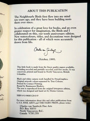 The book: Attractive and scarce 10th anniversary edition of this wonderful collection of illustrations about different birds seen in Canada: Robin, wren, warbler, crow, heron, and pelican, based on the earlier edition but with ten new wonderful color illustrations.