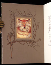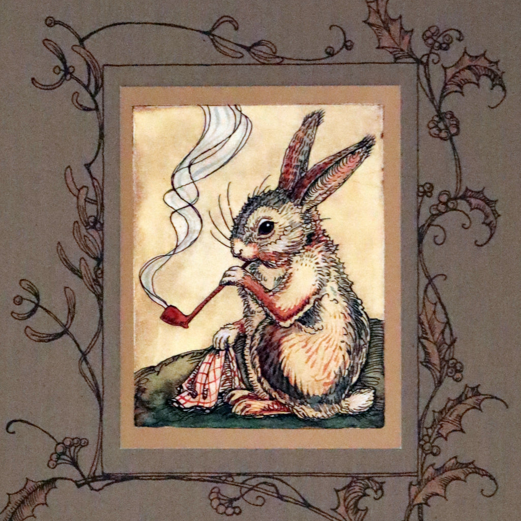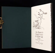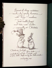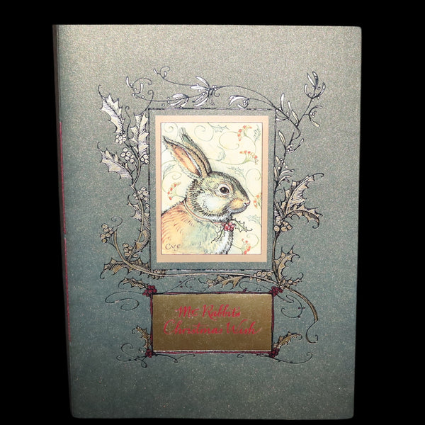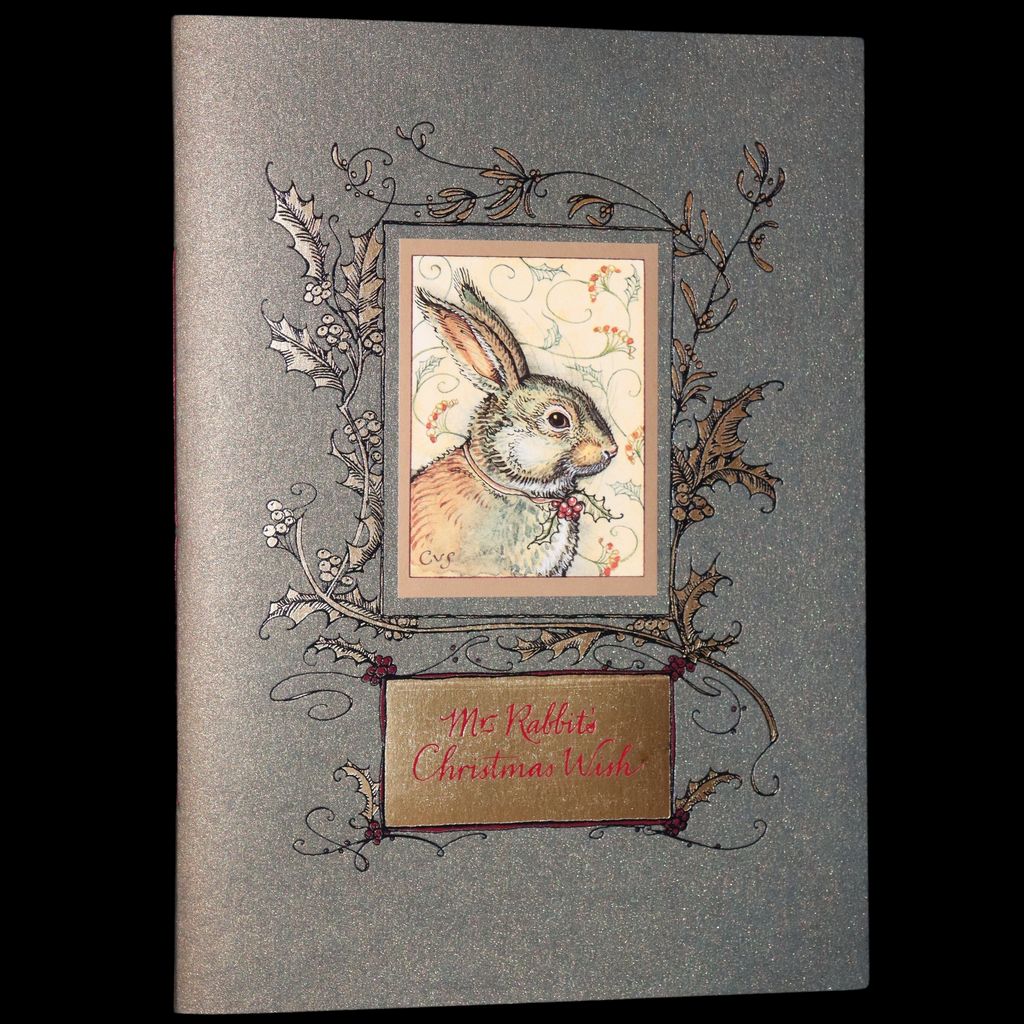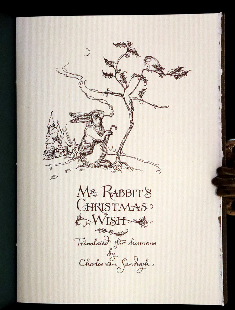The book: Beautiful Edition of Mr. Rabbit's Christmas Wish (translated for humans by Charles van Sandwyk), contains Christmas wishes thought up by Mr. Rabbit for his woodland companions, featuring calligraphic text and watercolour illustrations tipped-in.