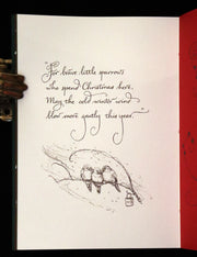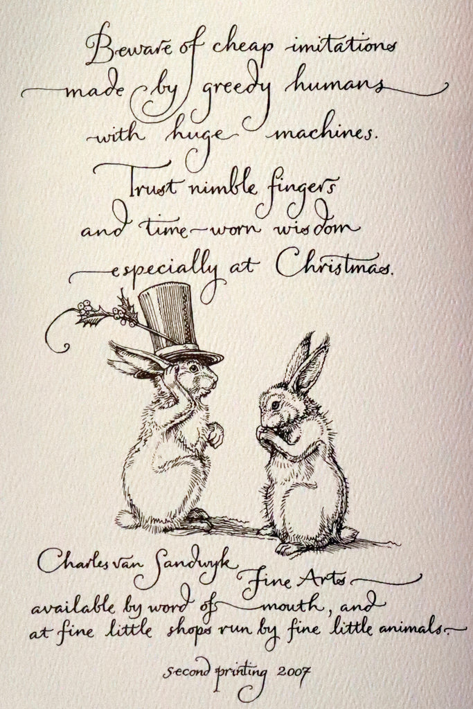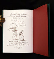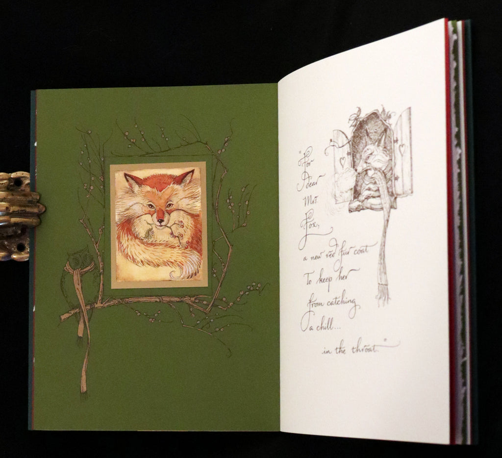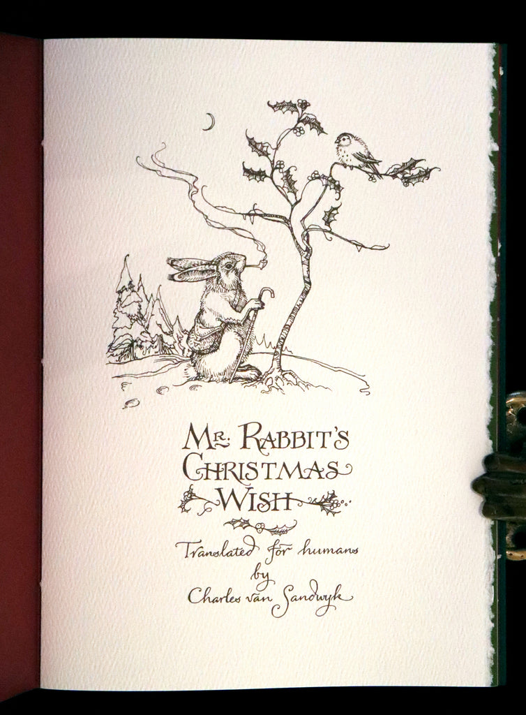 The book: Beautiful Limited Edition of Mr. Rabbit's Christmas Wish (translated for humans by Charles van Sandwyk), It contains Christmas wishes thought up by Mr. Rabbit for his woodland companions, featuring calligraphic text and watercolor illustrations tipped-in.