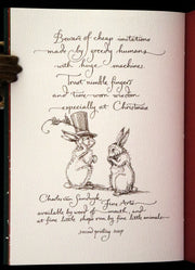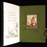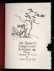 The book: Beautiful Limited Edition of Mr. Rabbit's Christmas Wish (translated for humans by Charles van Sandwyk), contains Christmas wishes thought up by Mr. Rabbit for his woodland companions, featuring calligraphic text and watercolor illustrations tipped-in.