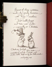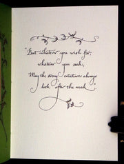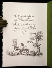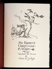 The book: Beautiful Limited Edition of Mr. Rabbit's Christmas Wish (translated for humans by Charles van Sandwyk), contains Christmas wishes thought up by Mr. Rabbit for his woodland companions, featuring calligraphic text and watercolor illustrations tipped-in.