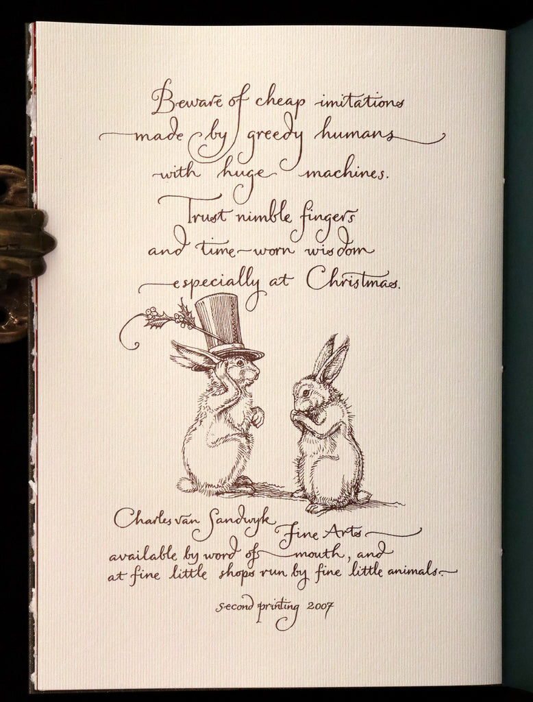 The book: Beautiful signed edition of Mr. Rabbit's Christmas Wish (translated for humans by Charles van Sandwyk), It contains Christmas wishes thought up by Mr. Rabbit for his woodland companions, featuring calligraphic text and watercolour illustrations tipped-in.