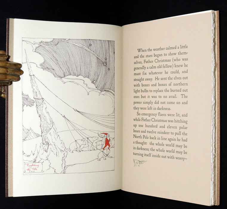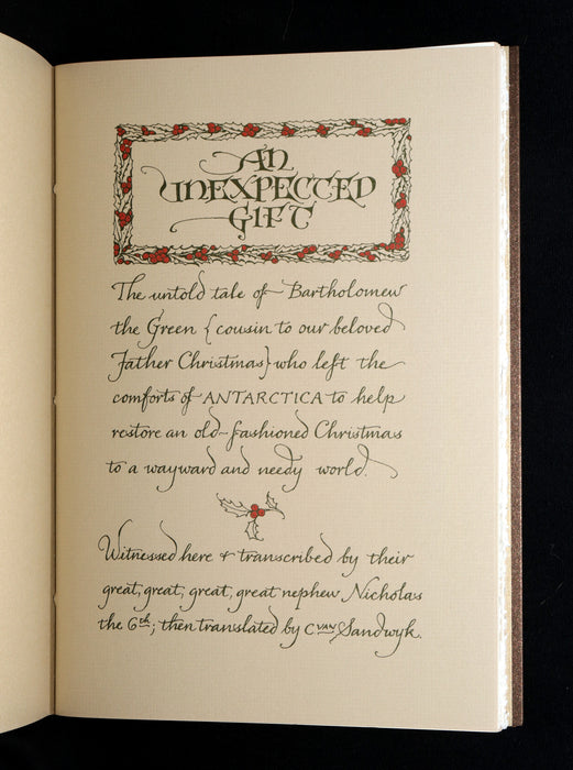The book: Attractive and rare Deluxe first edition of this gentle and traditional tale of Bartholomew the Green, cousin of Father Christmas, who leaves Antarctica on a mission to restore an old-fashioned Christmas to a wayward and needy world.