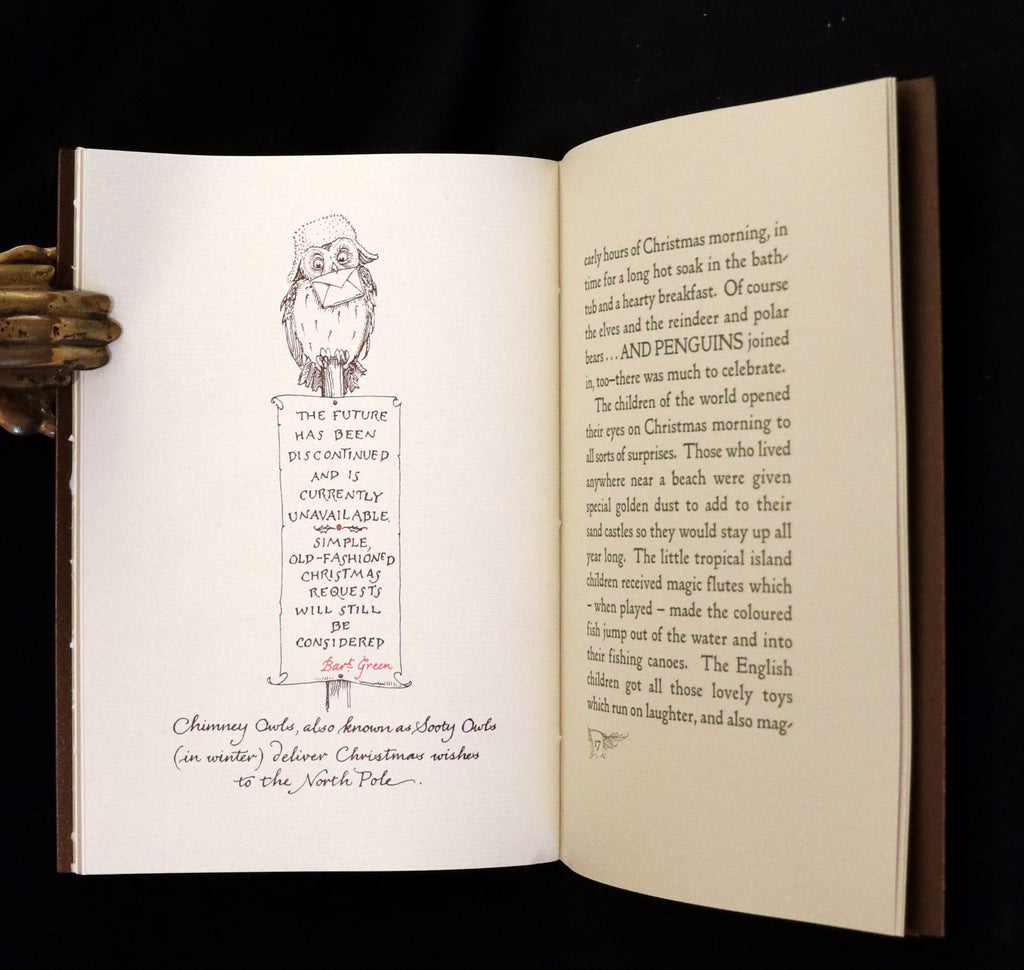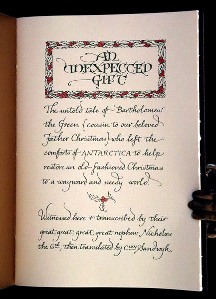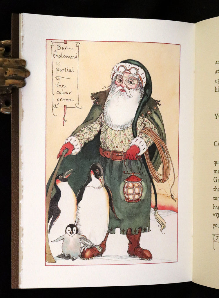 The book: Attractive and scarce Deluxe signed edition of this gentle and traditional tale of Bartholomew the Green, cousin of Father Christmas, who leaves Antarctica on a mission to restore an old-fashioned Christmas to a wayward and needy world.