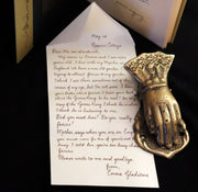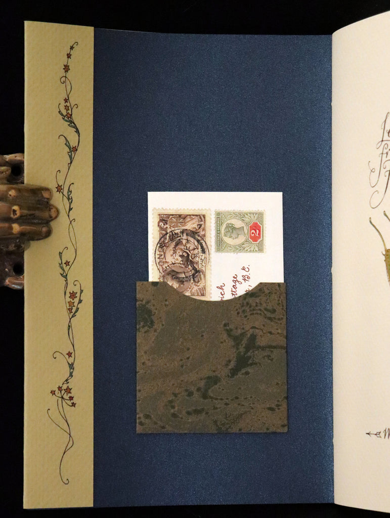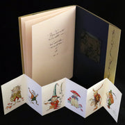 Content: Fine content (bright, tight and clean). Front and rear covers both affixed with marbled card pockets containing a neatly folded letter (including facsimile stamps and postmark) purportedly from Emma Gladstone to the artist and printed in van Sandwyk’s characteristic calligraphy; the rear pocket containing an accordion-folded 6-leaf panorama of Little People Common to the Natural Forest printed throughout in color to both sides. Also included are 4 other loose inserts in pockets including a letter; illustrated fairy bank notes; a Royal Summons from the King of the Woodland Gnomes; and a note written on a folded paper leaf. Includes three folded letters, three postage stamps, one leaf-shaped letter, and one accordion-folded illustration.