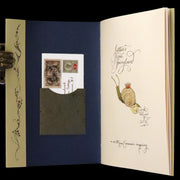 Content: Fine content (bright, tight, and clean). Front and rear covers are both affixed with marbled card pockets containing a neatly folded letter (including facsimile stamps and postmark) purportedly from Emma Gladstone to the artist and printed in van Sandwyk’s characteristic calligraphy; the rear pocket contains an accordion-folded 6-leaf panorama of Little People Common to the Natural Forest printed throughout in color to both sides. Also included are 4 other loose inserts in pockets including a letter; illustrated fairy bank notes; a Royal Summons from the King of the Woodland Gnomes; and a note written on a folded paper leaf. Includes three folded letters, three postage stamps, one leaf-shaped letter, and one accordion-folded illustration.
