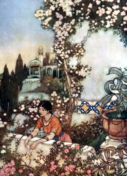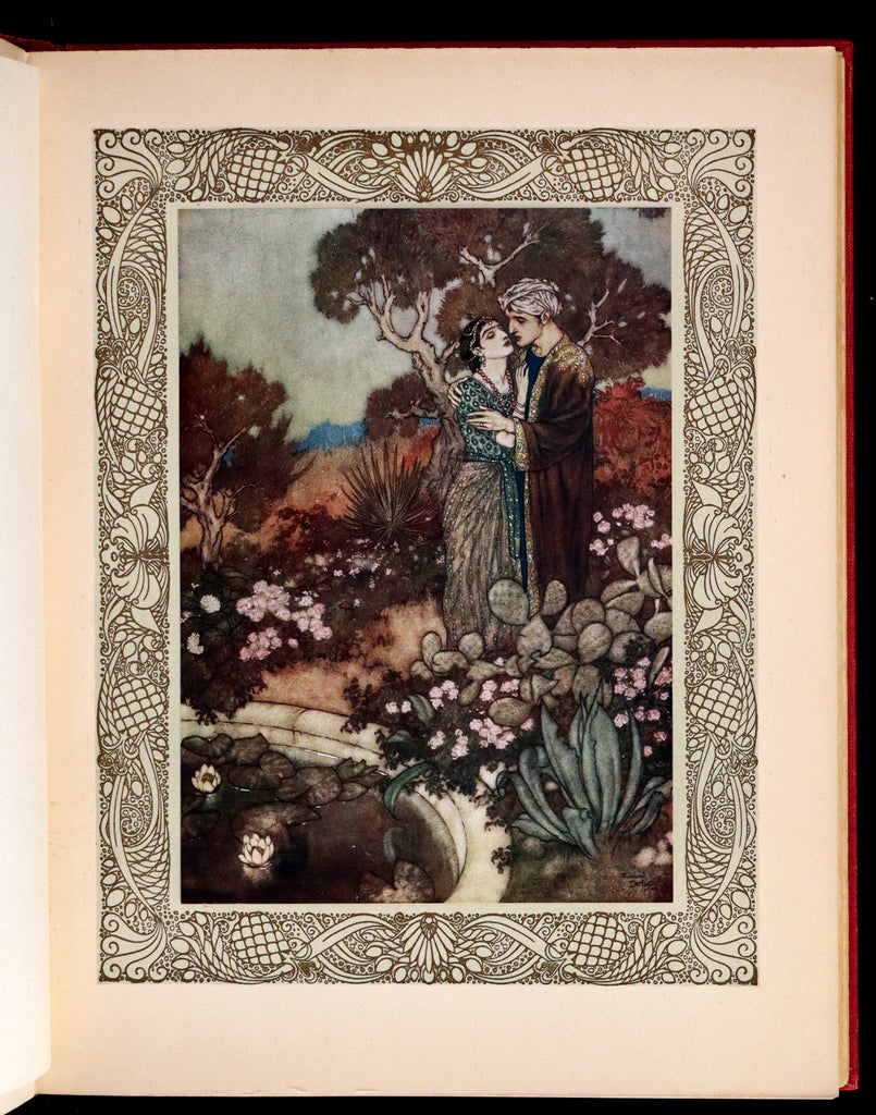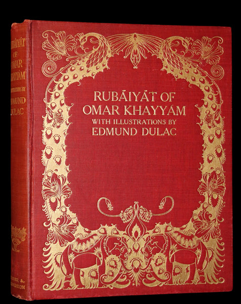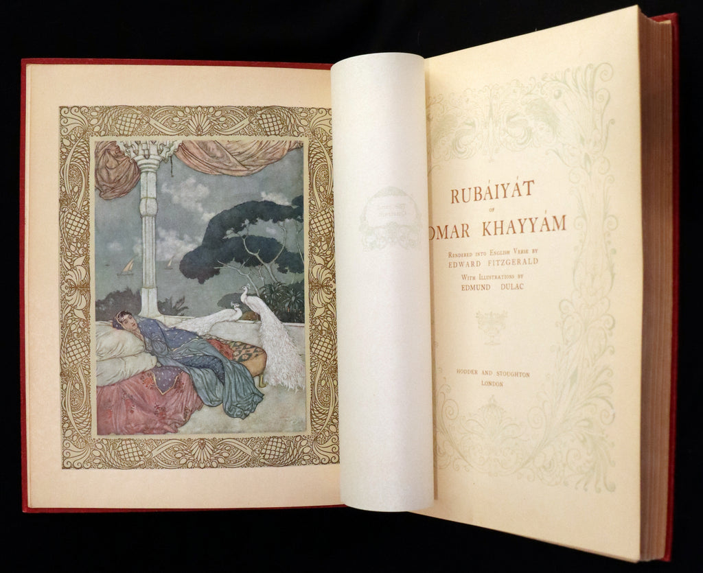 The book: Rare and beautiful First edition of Dulac's illustration for the Rubaiyat of Omar Khayyám -- Edward FitzGerald's translation of a selection of poems, originally written in Persian and numbering about a thousand, attributed to Omar Khayyám (1048–1131), a Persian poet, mathematician and astronomer. A ruba'i is a two-line stanza with two parts (or hemistichs) per line, hence the word rubayot (derived from the Arabic language root for "four"), meaning "quatrains." This "Rubaiyat of Omar Khayyam" is a poetic marvel, a fusion of Omar Khayyam's profound verses, Edward Fitzgerald's eloquent translation, and Edmund Dulac's breathtaking illustrations. This edition is a tribute to a collaboration of literary and artistic mastery.